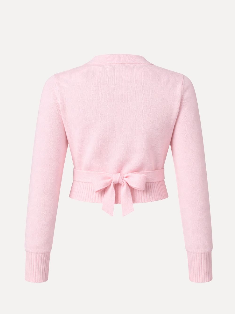 Gebreide linten aan de voorkant gekruist en vastgestrikt op de rugzijde voor een verfijnde look.
